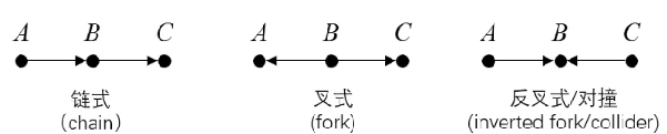 - 链式(A->B->C)、叉式(A<-B->C):控制B可阻断A和C间信息流动