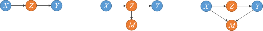 比如下图,第一个,不应该控制Z,第二个和第三个都是Z和M都不应该被控制。从这些案例我们知道,并不是控制变量越多越好,基于观察数据的分析,什么变量需要控制,什么变量不需要控制需要基于因果图来确定。