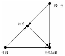 在处理交叉影响时,因果图似乎不完备(或有问题)。如,女生更偏好难录取的院系,院长根据居住州和性别共同决定录取结果,只要家乡的男生,其他地方的女生。此时居住州对性别和院系都没有因果关系,即改变居住州,不会影响学生申请的院系或性别。所以因果图应该如下: