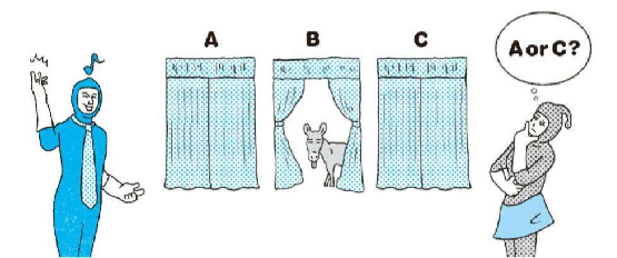 悖论:有三扇门,门后有车、山羊、山羊。你如果选中有车的门,车就归你。现在你选择了A门,主持人打开了另一扇后面有山羊的B门,问你是否要将你的选择换成C门。