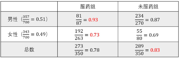 悖论:辛普森医生发现一种新药,吃了的人比不吃的人发病率低(0.78 vs 0.83),但这种药似乎对男性和女性都有害,吃了的男性比不吃的男性发病率高(0.93 vs 0.87),吃了药的女性也比不吃药的女性发病率高(0.73 vs 0.69)。