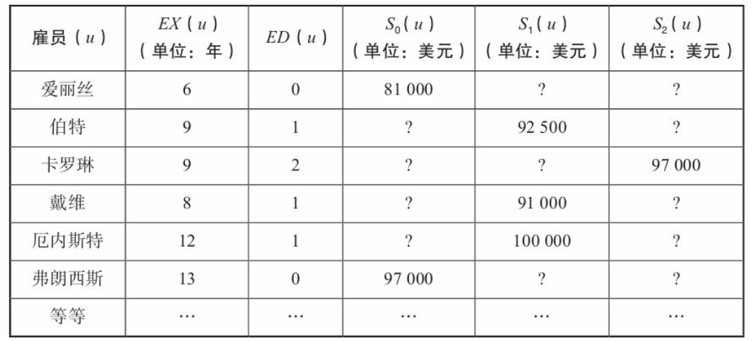 给个案例:如果工资(S)由学历(ED,0:高中,1:大学,2,硕士)和工作经验(EX,年数)决定。现在有以下数据,问题是如果爱丽丝上大学了,工资是多少?